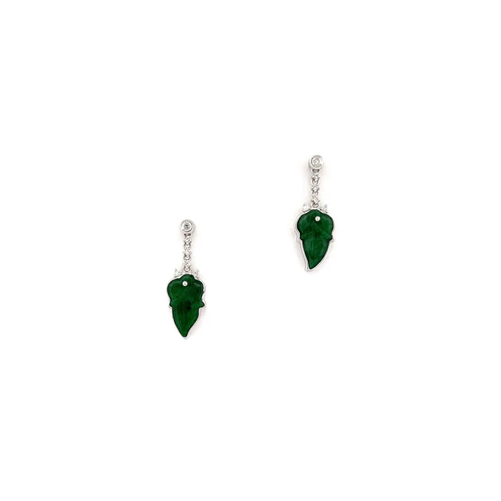 Jade Earring - Deep Green Colored Saddle Shaped Jadeite Jade Carved mounted 18K White Gold Setting with Rounded Diamonds 0.06 cts
